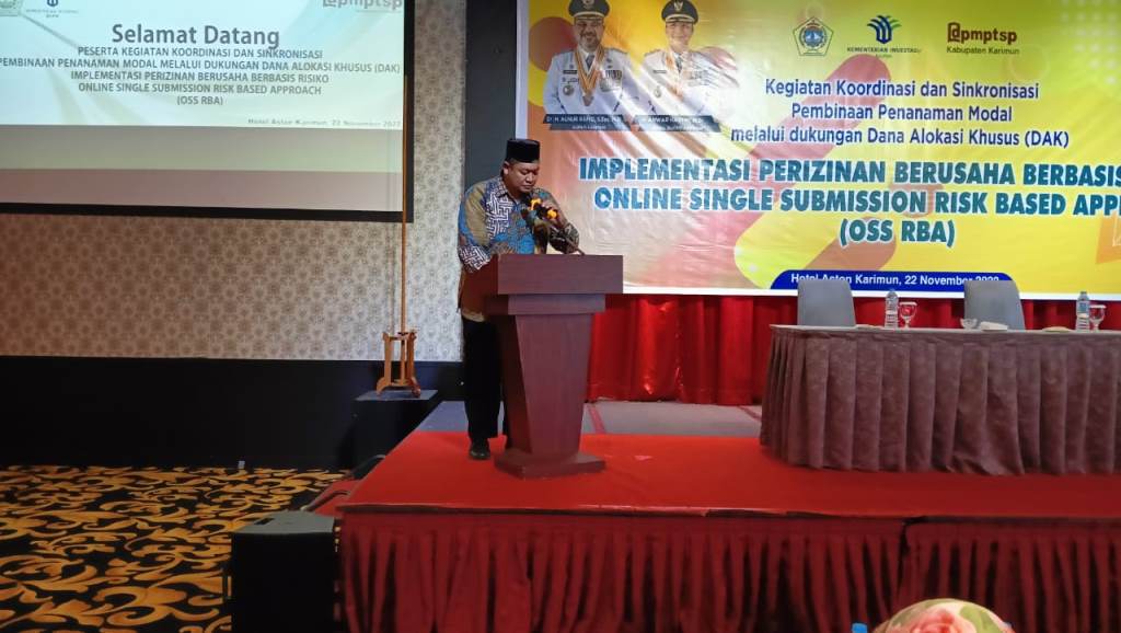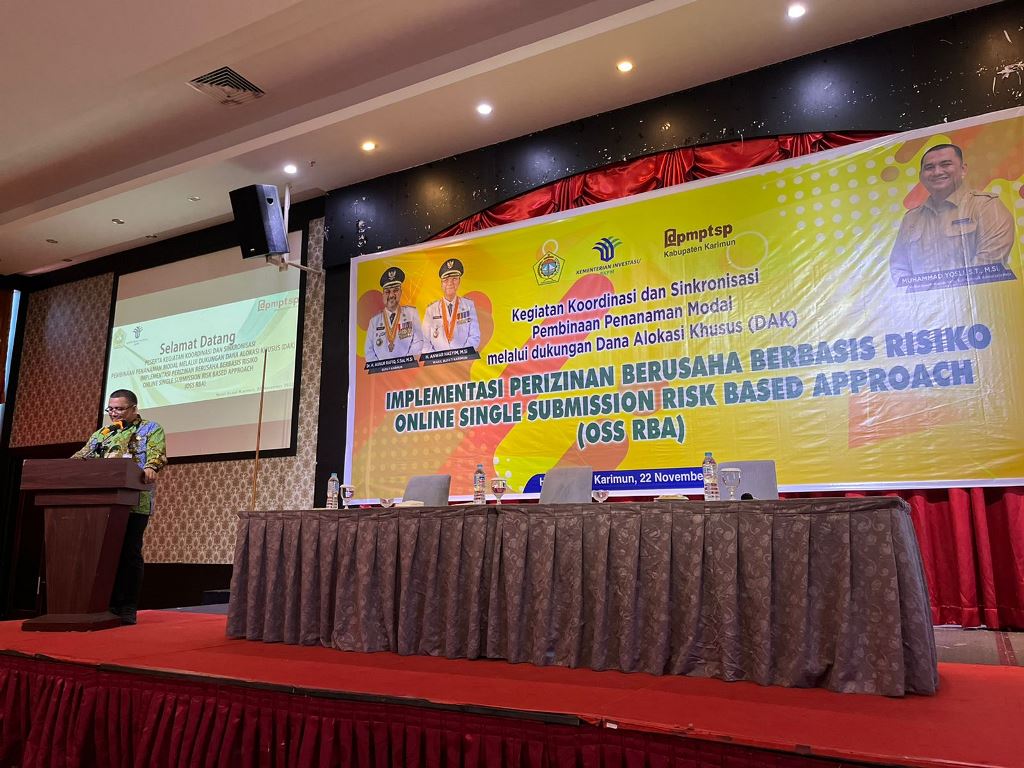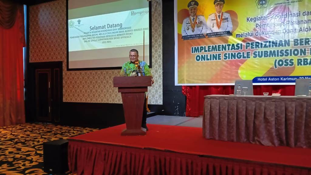 Bupati Karimun, Bpk Dr. H. Aunur Rafiq, S.Sos., M.Si., menghadiri sekaligus membuka acara Kegiatan Koordinasi Dan Sinkronisasi Pembinaan Penanaman Modal Melalui Dukungan Dana Alokasi Khusus (Dak) Implementasi Perizinan Berusaha Berbasis Risiko Online Single Submission Risk Based Approach (OSS RBA) di Ballroom Hotel Aston Karimun, Selasa (22/11).