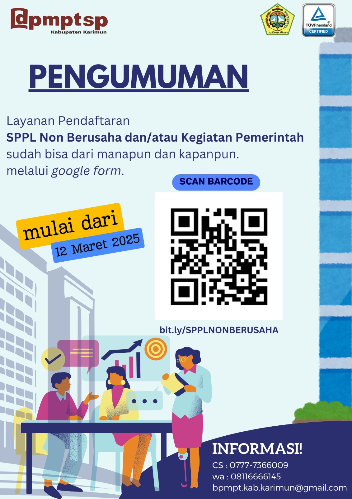 Pengumuman Layanan Pendaftaran SPPL Non Berusaha dan atau Kegiatan Pemerintah Admin DPMPTSP Karimun10 Maret 2025 595 Less than a minute Admin DPMPTSP Karimun10 Maret 2025 595 Less than a minute Facebook Twitter Messenger Messenger WhatsApp Telegram Share via Email Print