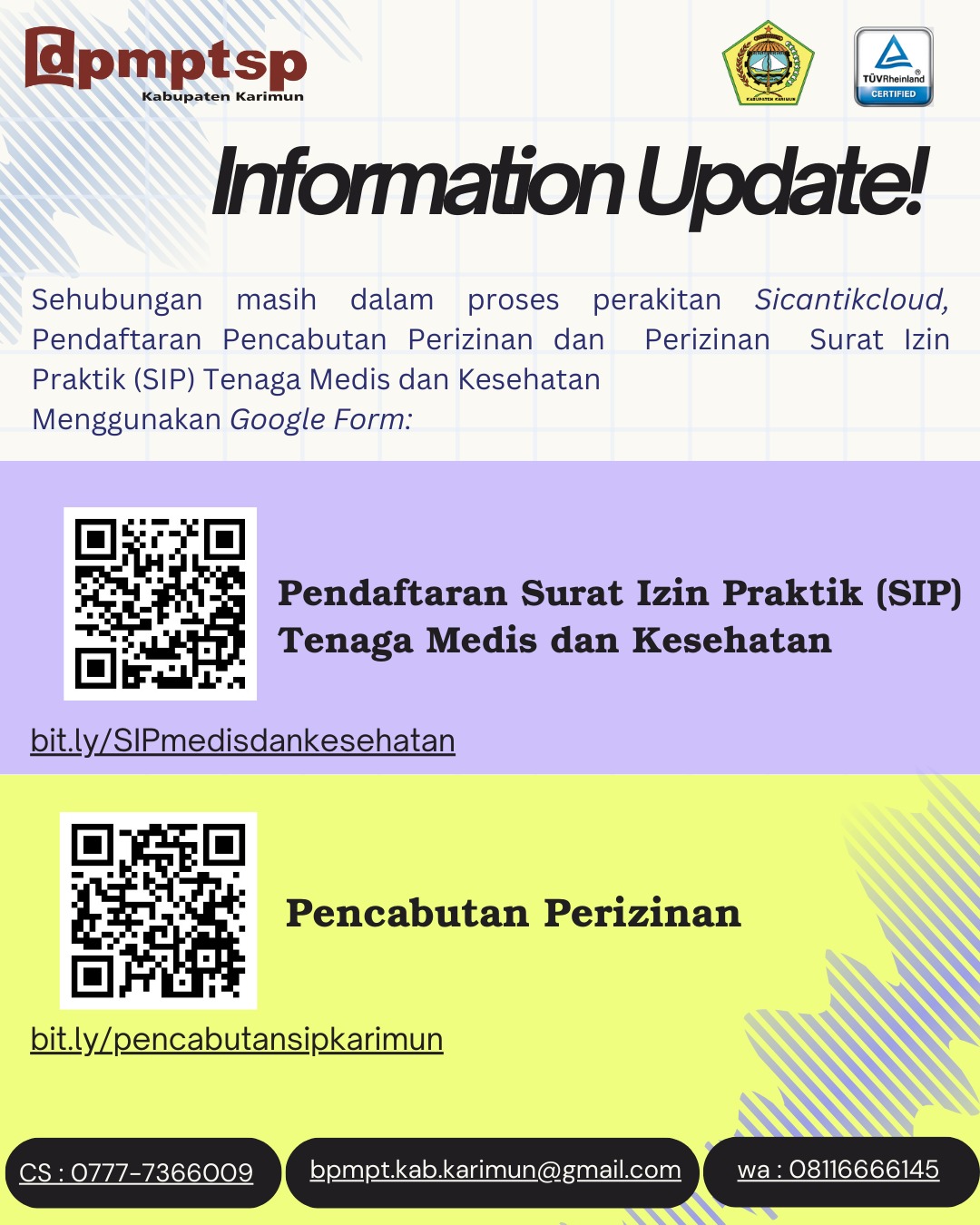 Informasi Update Pendaftaran SIP dan Pencabutan Perizinan Admin DPMPTSP Karimun12 Maret 2025 978 Less than a minute Admin DPMPTSP Karimun12 Maret 2025 978 Less than a minute Facebook Twitter Messenger Messenger WhatsApp Telegram Share via Email Print